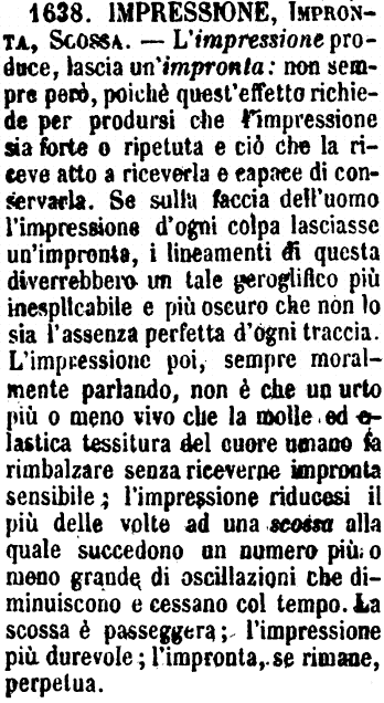 | Impressione, Impronta, Scossa - L'impressione produce, lascia un'impronta: non sempre però, poichè quest'effetto richiede per prodursi che l'impressione sia forte o ripetuta e ciò che la riceve atto a riceverla e capace di conservarla. Se sulla faccia dell'uomo l'impressione d'ogni colpa lasciasse un'impronta, i lineamenti di questa diverrebbero un tale geroglifico più inesplicabile e più oscuro che non lo sia l'assenza perfetta d'ogni traccia. L'impressione poi, sempre moralmente parlando, non è che un urto più o meno vivo che la molle ed elastica tessitura del cuore umano fa rimbalzare senza riceverne impronta sensibile; l'impressione riducesi il più delle volte ad una scossa alla quale succedono un numero più o meno grande di oscillazioni che diminuiscono e cessano col tempo. La scossa è passeggera; l'impressione più durevole; l'impronta, se rimane, perpetua. [immagine] |