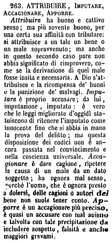 | Accusare, Imputare, Apporre, Dare la colpa, Incolpare - Accusare è il Denunziare apertamente, o appresso il tribunale o appresso i superiori. - Imputare è Attribuire ad alcuno una colpa o un delitto, o di atto o di volontà. - L'Apporre è parimente Attribuire ad altri una colpa; ma senza fondamento certo. - «Lo apposero a lui, ma era innocente.» - Incolpare e Dare la colpa è lo stesso; ma può anche farsi per via di semplice e lieve congettura. [immagine] |
