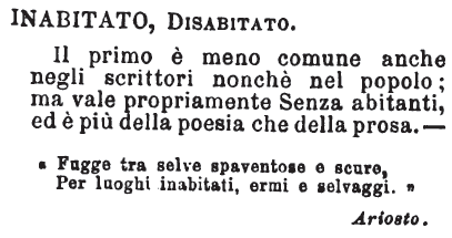 Inabitato, Disabitato - Il primo è meno comune anche negli scrittori nonchè nel popolo; ma vale propriamente Senza abitanti, ed è più della poesia che della prosa. -