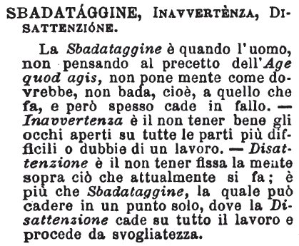 | Sbadataggine, Inavvertenza, Disattenzione - La Sbadataggine è quando l'uomo, non pensando al precetto dell'Age quod agis, non pone mente come dovrebbe, non bada, cioè, a quello che fa, e però spesso cade in fallo. - Inavvertenza è il non tener bene gli occhi aperti su tutte le parti più difficili o dubbie di un lavoro. - Disattenzione è il non tener fissa la mente sopra ciò che attualmente si fa; è più che Sbadataggine, la quale può cadere in un punto solo, dove la Disattenzione cade su tutto il lavoro e procede da svogliatezza. [immagine] |