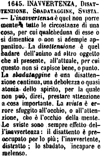 | Inavvertenza, Disattenzione, Sbadataggine, Svista - L'inavvertenza è quel non porre mente a tutte le circostanze di una cosa, per cui qualcheduna di esse o si dimentica o non si adempie appuntino. La disattenzione è quel badare dell'animo ad altro oggetto che al presente, all'attuale, per cui questo non si capisce bene, o punto. La sbadataggine è una disattenzione continua, una debolezza o quasi atonia dello spirito, per la quale non può, direi, prestare attenzione a cosa importante. La svista è errore sfuggito all'occhio, o all'attenzione, che è l'occhio della mente. Le sviste sono sempre effetto dell'inavvertenza: il disattento è preocupato per lo più; l'inavvertente, distratto; lo sbadato, incapace e melenso. [immagine] |