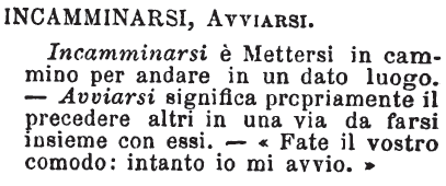 | Incamminarsi, Avviarsi - Incamminarsi è Mettersi in cammino per andare in un dato luogo. - Avviarsi significa propriamente il precedere altri in una via da farsi insieme con essi. - « Fate il vostro comodo: intanto io mi avvio. » [immagine] |