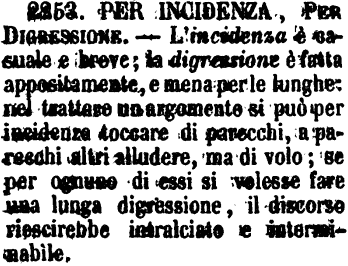 | Per incidenza, Per digressione - L'incidenza è casuale e breve; la digressione è fatta appositamente, e mena per le lunghe: nel trattare un argomento si può per incidenza toccare di parecchi, a parecchi altri alludere, ma di volo; se per ognuno di essi si volesse fare una lunga digressione, il discorso riescirebbe intralciato e interminabile. [immagine] |