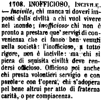 | Inofficioso, Incivile - Incivile, chi manca ai doveri imposti dalla civiltà a chi vuol vivere nel mondo; inofficioso chi non è pronto a prestare que' servigi di convenienza che ci fanno ben venuti nella società: l'inofficioso, a tutto rigore, non è incivile: ma chi si picca di squisita civiltà deve rendersi officioso. Officioso poi anche chi presta volontieri servigio e con parole e con l'opera, chi s'adopera pel bene altrui per atto di fraterna carità, o per compiacenza. [immagine] |