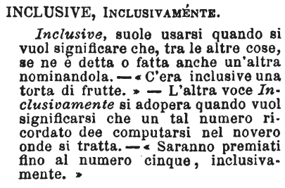 | Inclusive, Inclusivamente - Inclusive, suole usarsi quando si vuol significare che, tra le altre cose, se ne è detta o fatta anche un'altra nominandola. - «C'era inclusive una torta di frutte.» - L'altra voce Inclusivamente si adopera quando vuol significarsi che un tal numero ricordato dee computarsi nel novero onde si tratta. - «Saranno premiati fino al numero cinque, inclusivamente.» [immagine] |
