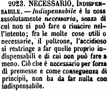 | Necessario, Indispensabile - Indispensabile è la cosa assolutamente necessaria, senza di cui non si può fare o riuscire nell'intento; fra le molte cose utili o necessarie, il poltrone, l'accidioso si restringe a far quelle proprio indispensabili e di cui non può fare a meno. Ciò che è necessario per forza di premesse e come conseguenza di principii, non ha da far nulla con indispensabile. [immagine] |