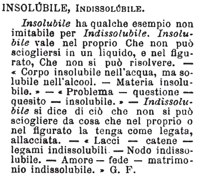 | Insolubile, Indissolubile - Insolubile ha qualche esempio non imitabile per Indissolubile. Insolubile vale nel proprio Che non può sciogliersi in un liquido, e nel figurato, Che non si può risolvere. - « Corpo insolubile nell'acqua, ma solubile nell'alcool. - Materia insolubile. » - « Problema - questione - quesito - insolubile. » - Indissolubile si dice di ciò che non si può sciogliere da cosa che nel proprio o nel figurato la tenga come legata, allacciata. « Lacci - catene - legami indissolubili. - Nodo indissolubile. - Amore - fede - matrimonio indissolubile. » G. F. [immagine] |