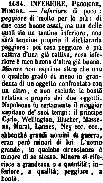 Inferiore, Peggiore, Minore - Inferiore di poco: peggiore di molto per lo più: di due cose buone assai, ma una delle quali sia un tantino inferiore, non sarà termine proprio il dichiararla peggiore: poi cosa peggiore è più cattiva d'una già cattiva; cosa inferiore è men buona d'altra già buona. Minore non esprime altro che uno o qualche grado di meno in grandezza di un oggetto confrontato con un altro, e non esclude la bontà relativa e propria dei due oggetti. Napoleone fu certamente il maggior capitano de' suoi tempi: il principe Carlo, Wellington, Blucher, Massena, Murat, Lannes, Ney ecc. ecc., abbenchè grandi uomini di guerra, eran però minori di lui. L'uomo grande, in qualche circostanza è minore di se stesso. Minore si riferisce a grandezza o a quantità; inferiore, a qualità; peggiore, a bontà. [immagine]