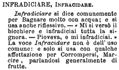 «Infradiciare, corrotto d'infracidire, dovrebb'essere quasi sinonimo a putrefare, corrompere: ma perchè la corruzione è prodotta o aiutata dall'umidità, però infradiciare venne, nella lingua toscana parlata, ad esprimere l'effetto d'umore versato sopra un corpo. Ben serberemo però infracidare ad esprimere corruzione, infradiciare ad esprimere bagnamento. S'infradicia la terra d'acqua: uno è tutto fradicio dalla pioggia; è per terra un gran fradicio; è nella stanza un gran fradiciume. S'infradicia un corpo senza metterlo in molle. D'olio, d'acqua forte o d'altri liquori simili, infradiciare non si dirà, credo». Tommaseo. [immagine] |