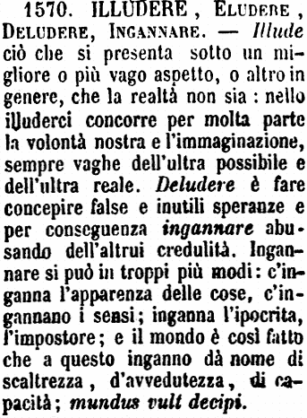 | Illudere, Eludere, Deludere, Ingannare - Illude ciò che si presenta sotto un migliore o più vago aspetto, o altro in genere, che la realtà non sia: nello illuderci concorre per molta parte la volontà nostra e l'immaginazione, sempre vaghe dell'ultra possibile e dell'ultra reale. Deludere è fare concepire false e inutili speranze e per conseguenza ingannare abusando dell'altrui credulità. Ingannare si può in troppi più modi: c'inganna l'apparenza delle cose, c'ingannano i sensi; inganna l'ipocrita, l'impostore; e il mondo è così fatto che a questo inganno dà nome di scaltrezza, d'avvedutezza, di capacità; mundus vult decipi. [immagine] |
