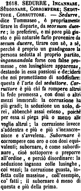 | Sedurre, Ingannare, Subornare, Corrompere; Seduttore, Corruttore - Sedurre, dice Tommaseo, è propriamente tirare in disparte, da seorsum ducere; io preferirei, e mi pare più giusto e più naturale farlo provenire da secum ducere, tirare con sè, a sè, perchè è proprio un guadagnare la persona sedotta al proprio partito, ingannandola forse con false promesse, con lusinghiere apparenze, destando in essa passioni e desiderii che noi promettiamo di soddisfare: questa è l'arte del seduttore. Corruttore è più chi fa rompere altrui la fede promessa, con doni o altri mezzi immorali: la corruzione ha più gradi; la seduzione un solo, direi, abbenchè assai esteso, poichè per essa si piega più o meno alle voglie altrui; la corruzione invece s'addentra e più e più s'incancrenisce e s'avvelena. Subornare è corrompere con oro o con doni equivalenti; subornare, è come subordinare, cioè sottoporre o preporre all'ordine, e perciò disordinare: la seduzione inganna colle lusinghe, coi vezzi; la corruzione guasta, infetta colle massime, coll'esempio, co' fatti; il subornare è meno di questa e più della prima. [immagine] |