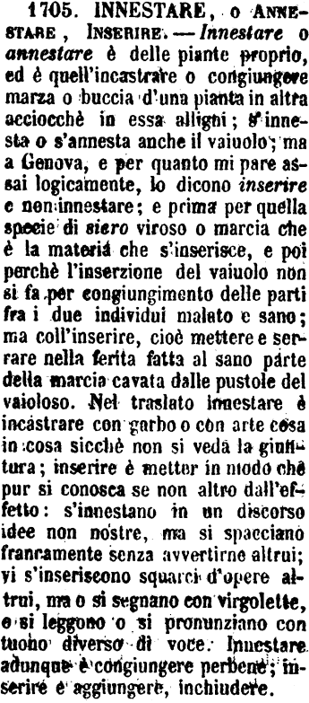 | Innestare, o Annestare, Inserire - Innestare o annestare è delle piante proprio, ed è quell'incastrare o congiungere marza o buccia d'una pianta in altra acciocchè in essa alligni: s'innesta o s'annesta anche il vaiuolo: ma a Genova, e per quanto mi pare assai logicamente, lo dicono inserire e non innestare; e prima per quella specie di siero viroso o marcia che è la materia che s'inserisce, e poi perchè l'inserzione del vaiuolo non si fa per congiungimento delle parti fra i due individui malato e sano; ma coll'inserire, cioè mettere e serrare nella ferita fatta al sano parte della marcia cavata dalle pustole del vaioloso. Nel traslato innestare è incastrare con garbo o con arte cosa in cosa sicchè non si veda la giuntura; inserire e mettere in modo che pur si conosca se non altro dall'effetto: s'innestano in un discorso idee non nostre, ma si spacciano francamente senza avvertirne altrui; vi s'inseriscono squarci d'opere altrui, ma o si segnano con virgolette, o si leggono o si pronunziano con tuono diverso di voce. Innestare adunque è congiungere perbene; inserire è aggiungere, inchiudere. [immagine] |