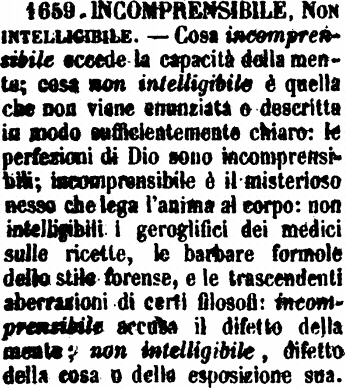 Incomprensibile, Non intelligibile - Cosa incomprensibile eccede la capacità della mente; cosa non intelligibile è quella che non viene enunziata o descritta in modo sufficientemente chiaro: le perfezioni di Dio sono incomprensibili; incomprensibile è il misterioso nesso che lega l'anima al corpo: non intelligibili i geroglifici dei medici sulle ricette, le barbare formole dello stile forense, e le trascendenti aberrazioni di certi filosofi: incomprensibile accusa il difetto della mente; non intelligibile, difetto della cosa o della esposizione sua. [immagine]