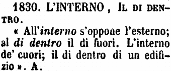 | L’interno, Il di dentro - «All'interno s'oppone l'esterno; al di dentro il di fuori. L'interno de' cuori; il di dentro di un edifizio». A. [immagine] |