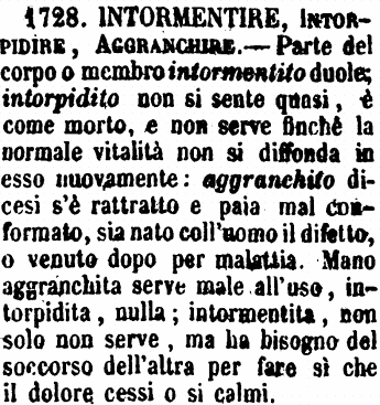 Intormentire, Intorpidire, Aggranchire - Parte del corpo o membro intormentito duole; intorpidito non si sente quasi, è come morto, e non serve finchè la normale vitalità non si diffonda in esso nuovamente: aggranchito dicesi s'è rattratto e paia mal conformato, sia nato coll'uomo il difetto, o venuto dopo per malattia. Mano aggranchita serve male all'uso, intorpidita, nulla; intormentita, non solo non serve, ma ha bisogno del soccorso dell'altra per fare sì che il dolore cessi o si calmi. [immagine]