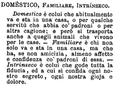 | Domestico, Familiare, Intrinseco - Domestico è colui che abitualmente va e sta in una casa, o per qualche servitù che abbia co' padroni o per altra cagione; e però si trasporta anche a quegli animali che vivono per le case. - Familiare è chi non solo va e sta in una casa, ma che ha, se non amicizia, almeno affetto e confidenza co' padroni di essa. - Intrinseco è colui che gode tutta la fiducia, ed a cui si confida ogni nostro segreto, ogni nostra gioja e dolore. [immagine] |