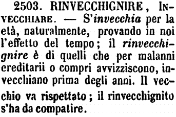 Rinvecchignire, Invecchiare - S'invecchia per la età, naturalmente, provando in noi l'effetto del tempo; il rinvecchignire è di quelli che per malanni ereditarii o compri avvizziscono, invecchiano prima degli anni. Il vecchio va rispettato; il rinvecchignito s'ha da compatire. [immagine]