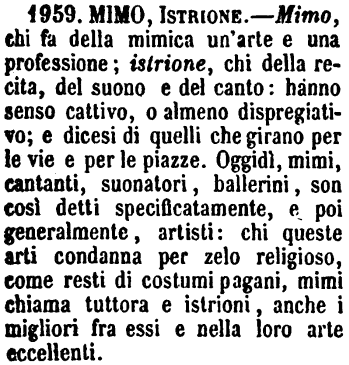 | Mimo, Istrione - Mimo, chi fa della mimica un'arte e una professione; istrione, chi della recita, del suono e del canto: hanno senso cattivo, o almeno dispregiativo; e dicesi di quelli che girano per le vie e per le piazze. Oggidì, mimi, cantanti, suonatori, ballerini, son così detti specificatamente, e poi generalmente, artisti: chi queste arti condanna per zelo religioso, come resti di costumi pagani, mimi chiama tuttora e istrioni, anche i migliori fra essi e nella loro arte eccellenti. [immagine] |