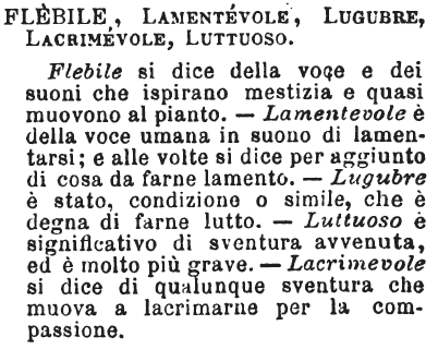 Flebile, Lamentevole, Lugubre, Lacrimevole, Luttuoso - Flebile si dice dlela voce e dei suoni che ispirano mestizia e quasi muovono al pianto. - Lamentevole è della voce umana in suono di lamentarsi; e alle volte si dice per aggiunto di cosa da farne lamento. - Lugubre è stato, condizione o simile, che è degna di farne lutto. - Luttuoso è significativo di sventura avvenuta, ed è molto più grave. - Lacrimevole si dice di qualunque sventura che muova a lacrimarne per la compassione. [immagine]