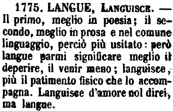 | Langue, Languisce - Il primo, meglio in poesia; il secondo, meglio in prosa e nel comune linguaggio, perciò più usitato: però langue parmi significare meglio il deperire, il venir meno; languisce, più il patimento fisico che lo accompagna. Languisce d'amore nol direi, ma langue. [immagine] |