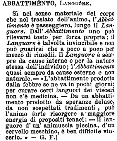 Abbattimento, Languore - Sì nel senso materiale del corpo che nel traslato dell'animo, l'Abbattimento è passeggiero, lungo il Languore. Dall'Abbattimento uno può rilevarsi tosto per forza propria; il Languore è talvolta invincibile e non può guarirsi che a poco a poco per mezzo di rimedii. Il Languore è sempre da cause interne e per la natura stessa dell'individuo; l'Abbattimento quasi sempre da cause esterne e non naturale. - «L'abbattimento prodotto dalla febbre se ne va in pochi giorni: per curare certi languori dei visceri non c'è medicina. - Da un abbattimento prodotto da speranze deluse, da non sospettati tradimenti, può l'animo forte risorgere a maggiore energia di propositi tenaci: - il languore d'un'animuccia piccina, d'un cervello meschino, è ben difficile vincerlo.» - G. F.] [immagine]