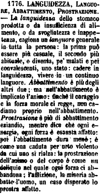 Languidezza, Languore, Abbattimento, Prostrazione - La languidezza dello stomaco prodotta o da insufficienza di alimento, o da svogliatezza e inappetenza, cagiona un languore generale in tutta la persona: la prima può essere più casuale, il secondo più abituale, e diventa, pe' malati e pei convalescenti, uno stato: cadere in languidezza, vivere in un continuo languore. Abbattimento è più degli altri due; ma nell'abbattimento è implicato l'animo: finchè il coraggio e la forza morale ci regge, non cadiamo proprio nell'abbattimento. Prostrazione è più di abbattimento eziandio, mentre dice che ogni energia, ogni forza è esausta affatto: poi l'abbattimento dura meno; è come una caduta per urto violento da cui uno si rialza: la prostrazione dell'animo o del corpo è come un deliquio nel quale ogni forza ci abbandona; l'afflizione, la miseria abbatte l'uomo, un caso disperato lo prostra affatto. [immagine]