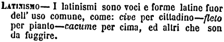 Latinismo - I latinismi sono voci e forme latine fuor dell'uso comune, come: cive per cittadino - fleto per pianto - cacume per cima, ed altri che son da fuggire. [immagine]