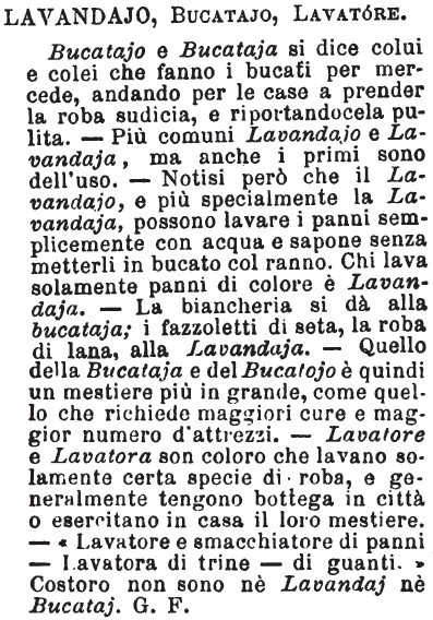 Lavandajo, Bucatajo, Lavatore - Bucatajo e Bucataja si dice colui e colei che fanno i bucati per mercede, andando per le case a prender la roba sudicia, e riportandocela pulita. - Più comuni Lavandajo e Lavandaja, ma anche i primi sono dell'uso. - Notisi però che il Lavandajo, e più specialmente la Lavandaja, possono lavare i panni semplicemente con acqua e sapone senza metterli in bucato col ranno. Chi lava solamente panni di colore è Lavandaja. - La biancheria si dà alla bucataja; i fazzoletti di seta, la roba di lana, alla Lavandaja. - Quello della Bucataja e del Bucatojo è quindi un mestiere più in grande, come quello che richiede maggiori cure e maggior numero d'attrezzi. - Lavatore e Lavatora son coloro che lavano solamente certa specie di roba, e generalmente tengono bottega in città o esercitano in casa il loro mestiere. - «Lavatore e smacchiatore di panni - Lavatora di trine - di guanti.» Costoro non sono nè LavandajBucataj. G. F. [immagine]
