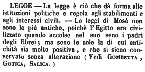 | Legge - La legge è ciò che dà forma alle istituzioni politiche e regola agli stabilimenti e agli interessi civili. - Le leggi di Mosè non sono le più antiche, poichè l'Egitto era civilizzato quando accolse nel suo seno i padri degli Ebrei; ma sono le sole la di cui antichità sia molto positiva, e che si sieno conservate senza alterazione (Vedi Gombetta, Gotica, Salica.) [immagine] |