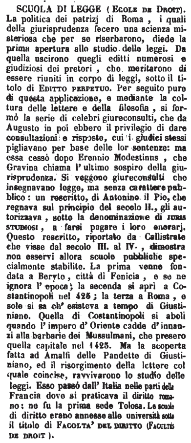 | Scuola di legge (Ecole de Droit) - La politica dei patrizj di Roma, i quali della giurisprudenza fecero una scienza misteriosa che per se riserbarono, diede la prima apertura allo studio delle leggi. Da quella uscirono quegli editti numerosi e giudiziosi dei pretori, che meritarono di essere riuniti in corpo di leggi, sotto il titolo di Editto perpetuo. Per seguito pure di questa applicazione, e mediante la coltura delle lettere e della filosofia, si formò la serie di celebri giureconsulti, che da Augusto in poi ebbero il privilegio di dare consultazioni e risposte, cui i giudici stessi pigliavano per base delle lor sentenze: ma essa cessò dopo Erennio Modestinus, che Gravina chiama l'ultimo sospiro della giurisprudenza. Si veggono giureconsulti che insegnavano legge, ma senza carattere pubblico: un rescritto, di Antonino il Pio, che regnava sul principio del secolo II., gli autorizzava, sotto la denominazione di juris studiosi, a farsi pagare i loro enorarj. Questo rescritto, riportato da Callistrate che visse dal secolo III. al IV., dimostra non esservi allora scuole pubbliche specialmente stabilite. La prima venne fondata a Beryte, città di Fenicia, e se ne ignora l'epoca; la seconda si aprì a Costantinopoli nel 425; la terza a Roma, e sole si sa ch'esisteva a tempo di Giustiniano. Quella di Costantinopoli si abolì quando l'impero d'Oriente cadde d'innanzi alla barbarie dei Mussulmani, che presero quella capitale nel 1425. Ma la scoperta fatta ad Amalfi delle Pandette di Giustiniano, ed il risorgimento della lettere col quale coincise, ravvivarono lo studio delle leggi. Esso passò dall'Italia nelle parti della Francia dove si praticava il diritto romano; ne fu la prima sede Tolosa. Le scuole di diritto erano annesse alle università sotto il titolo di Facoltà del diritto (Facultés de droit). [immagine] |