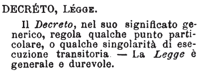 | Decreto, Legge - Il Decreto, nel suo significato generico, regola qualche punto particolare, o qualche singolarità di esecuzione transitoria. - La Legge è generale e durevole. [immagine] |