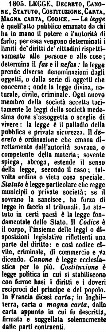 | Legge, Decreto, Canone, Statuto, Costituzione, Carta, Magna carta, Codice - La legge è quell’atto pubblico emanato da chi ha in mano il potere e l’autorità di farlo; per essa vengono determinati i limiti de’ diritti de’ cittadini rispettivamente alle persone e alle cose; determina il fas e il nefas: la legge prende diverse denominazioni dagli oggetti, o dalla serie di oggetti che concerne; onde la legge divina, naturale, civile, criminale. Ogni nuovo membro della società accetta tacitamente le leggi della società medesima dove s’assogetta o sceglie di vivere: la legge è il palladio della pubblica e privata sicurezza. Il decreto è ordinazione che emana direttamente dall’autorità sovrana, o competente della materia; sovente spiega, abroga, estende il senso della legge, secondo il caso; talvolta ordina o vieta cosa speciale. Statuto è legge particolare che regge municipii o private società; se il sovrano la sancisce, ha forza di legge in faccia ai tribunali. Lo statuto in certi paesi è la legge fondamentale dello Stato. Il Codice è il corpo, l’insieme delle leggi o disposizioni legislative riflettenti una parte del diritto: e così codice civile, criminale, di commercio e va dicendo. Canone è legge ecclesiastica per lo più. Costituzione è legge politica in cui si stabiliscono con ferme basi i diritti e i doveri reciproci del principe e del popolo. In Francia dicesi carta; in Inghilterra, carta o magna carta, dalla carta appunto in cui fu descritta, firmata e suggellata solennemente dalle parti contraenti. [immagine] |