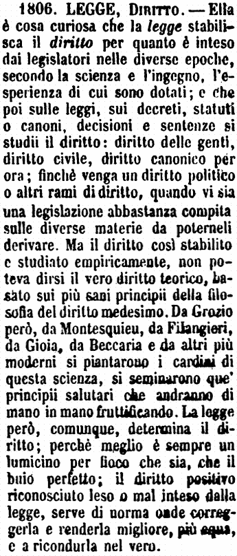 | Legge, Diritto - Ella è cosa curiosa che la legge stabilisca il diritto per quanto è inteso dai legislatori nelle diverse epoche, secondo la scienza e l'ingegno, l'esperienza di cui sono dotati; e che poi sulle leggi, sui decreti, statuti o canoni, decisioni e sentenze si studii il diritto: diritto delle genti, diritto civile, diritto canonico per ora; finchè venga un diritto politico o altri rami di diritto, quando vi sia una legislazione abbastanza compita sulle diverse materie da poterneli derivare. Ma il diritto così stabilito e studiato empiricamente, non poteva dirsi il vero diritto teorico, basato sui più sani principii della filosofia del diritto medesimo. Da Grozio però, da Montesquieu, da Filangieri, da Gioia, da Beccaria e da altri più moderni si piantarono i cardini di questa scienza, si seminarono que' principii salutari che andranno di mano in mano fruttificando. La legge però, comunque, determina il diritto; perchè meglio è sempre un lumicino per fioco che sia, che il buio perfetto; il diritto positivo riconosciuto leso o mal inteso dalla legge, serve di norma onde correggerla e renderla migliore, più equa, e a ricondurla nel vero. [immagine] |