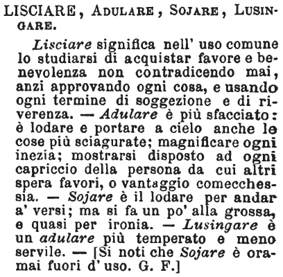 | Lisciare, Adulare, Sojare, Lusingare - Lisciare significa nell'uso comune lo studiarsi di acquistar favore e benevolenza non contradicendo mai, anzi approvando ogni cosa, e usando ogni termine di soggezione e di riverenza. - Adulare è più sfacciato: è lodare e portare a cielo anche le cose più sciagurate; magnificare ogni inezia; mostrarsi disposto ad ogni capriccio della persona da cui altri spera favori, o vantaggio comecchessia. - Sojare è il lodare per andar a' versi; ma si fa un po' alla grossa, e quasi per ironia. - Lusingare è un adulare più temperato e meno servile. - [Si noti che Sojare è oramai fuori uso. G. F.] [immagine] |
