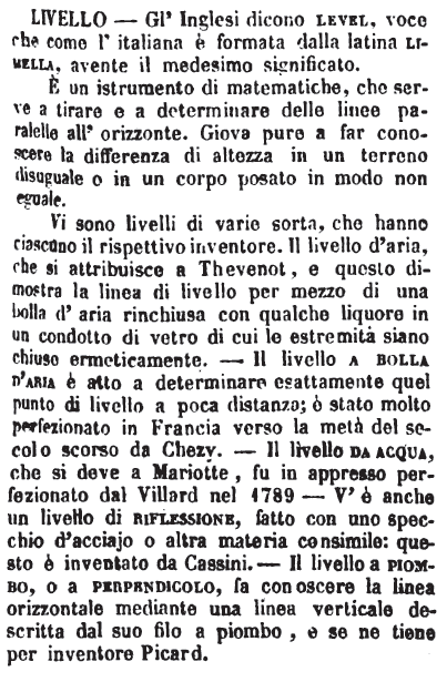 | Livello - Gl'Inglesi dicono level, voce che come l'italiana è formata dalla latina livella, avente il medesimo significato.