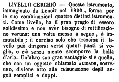 | Livello-Cerchio - Questo istrumento, immaginato da Lenoir nel 1820, forma per le sue combinazioni quattro distinti istrumenti. Come livello, ha il gran pregio di essere solidissimo e non aver bisogno di rettificazione veruna: una volta messo a segno, è immutabile; il cerchio solo che trascina il livello può dirigersi verso quanti punti si voglia, e ciò senza niente scomporre la bolla d'aria. Un'altro suo gran vantaggio si è quello, che con un oggetto chiamato alidade, sostegno, diviene atto alla misurazione degli angoli semplici e doppi. [immagine] |