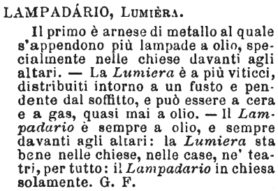 Lampadario, Lumiera - Il primo è arnese di metallo al quale s'appendono più lampade ad olio, specialmente nelle chiese davanti agli altari. - La Lumiera è a più viticci, distribuiti intorno a un fusto e pendente dal soffitto, e può essere a cera e a gas, quasi mai a olio. - Il Lampadario è sempre a olio, e sempre davanti agli altari: la Lumiera sta bene nelle chiese, nelle case, ne' teatri, per tutto: il Lampadario in chiesa solamente. G. F. [immagine]