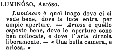 Luminoso, Arioso - Luminoso è quel luogo dove ci si vede bene, dove la luce entra per ampie aperture. - Arioso è quello esposto bene, dove le aperture sono ben collocate, e dove l'aria circola liberamente. - «Una bella camera, e ariosa.» [immagine]