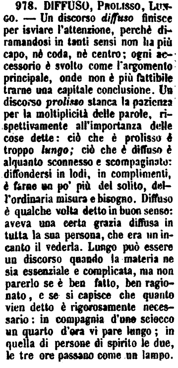 | Diffuso, Prolisso, Lungo - Un discorso diffuso finisce per isviare l'attenzione, perchè diramandosi in tanti sensi non ha più capo, nè coda, nè centro; ogni accessorio è svolto come l'argomento principale, onde non è più fattibile trarne una capitale conclusione. Un discorso prolisso stanca la pazienza per la moltiplicità delle parole, rispettivamente all'importanza delle cose dette: ciò che è prolisso è troppo lungo; ciò che è diffuso è alquanto sconnesso e scompaginato: diffondersi in lodi, in complimenti, è farne un po' più del solito, dell'ordinaria misura e bisogno. Diffuso è qualche volta detto in buon senso: aveva una certa grazia diffusa in tutta la sua persona, che era un incanto il vederla. Lungo può essere un discorso quando la materia ne sia essenziale e complicata, ma non parerlo se è ben fatto, ben ragionato, e se si capisce che quanto vien detto è rigorosamente necessario: in compagnia d'uno sciocco un quarto d'ora vi pare lungo; in quella di persone di spirito le due, le tre ore passano come un lampo. [immagine] |