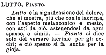 | Lutto, Pianto - Lutto è la significazione del dolore, che si mostra, più che con le lacrime, con l'aspetto melanconico e mesto, con atti da ciò, astenendosi da ogni spasso, e simili. - Pianto si dice solo del versare lacrime per gli occhi; e ciò spesso si fa anche per la gioja. [immagine] |