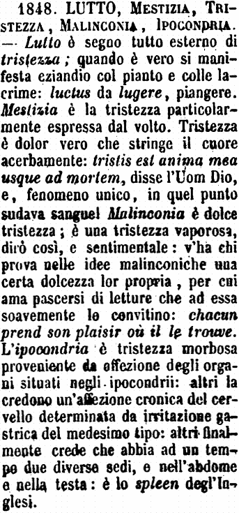 | Lutto, Mestizia, Tristezza, Malinconia, Ipocondria - Lutto è segno tutto esterno di tristezza; quando è vero si manifesta eziandio col pianto e colle lacrime: luctus da lugere, piangere. Mestizia è la tristezza particolarmente espressa dal volto. Tristezza è dolor vero che stringe il cuore acerbamente: tristis est anima mea usque ad mortem, disse l'Uom Dio, e, fenomeno unico, in quel punto sudava sangue! Malinconia è dolce tristezza; è una tristezza vaporosa, dirò così, e sentimentale: v'ha chi prova nelle idee malinconiche una certa dolcezza lor propria, per cui ama pascersi di letture che ad essa soavemente lo convitino: chacun prend son plaisir où il le trouve. L'ipocondria è tristezza morbosa proveniente da affezione degli organi situati negli ipocondrii: altri la credono un'affezione cronica del cervello determinata da irritazione gastrica del medesimo tipo: altri finalmente crede che abbia ad un tempo due diverse sedi, e nell'abdome e nella testa: è lo spleen degl'Inglesi. [immagine] |