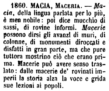 | Macia, Maceria - Macia, della lingua parlata per lo più, è men nobile: poi dice mucchio di sassi, di rovine informi. Macerie possono dirsi gli avanzi di muri, di colonne, di monumenti diroccati e disfatti in gran parte, ma che pure tuttora mostrino ciò che erano prima. Macerie può avere senso traslato: dalle macerie de' rovinati imperii la storia alza la voce e grida sue lezioni ai popoli. [immagine] |