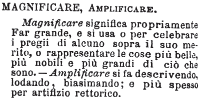| Magnificare, Amplificare - Magnificare significa propriamente Far grande, e si usa o per celebrare i pregii di alcuno sopra il suo merito, o rappresentare le cose più belle, più nobili e più grandi di ciò che sono. - Amplificaresi fa descrivendo, lodando, biasimando; e più spesso per artifizio rettorico. [immagine] |