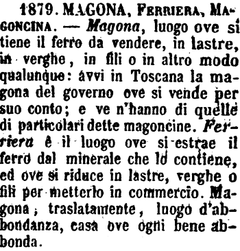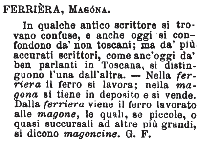 Ferriera, Magona - In qualche antico scrittore si trovano confuse, e anche oggi si confondono da' non toscani; ma da' più accurati scrittori, come anc'oggi da' ben parlanti in Toscana, si distinguono l'una dall'altra. - Nella ferriera il ferro si lavora; nella magona si tiene in deposito e si vende. Dalla ferriera viene il ferro lavorato alle magone, le quali, se piccole, o quasi succursali ad altre più grandi, si dicono magoncine. G. F. [immagine]