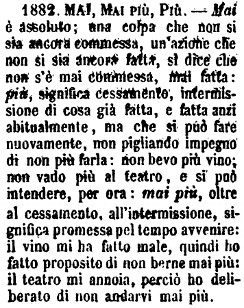 | Mai, Mai più, più - Mai è assoluto; una colpa che non si sia ancora commessa, un'azione che non si sia ancora fatta, si dice che non s'è mai commessa, mai fatta: più, significa cessamento, intermissione di cosa già fatta, e fatta anzi abitualmente, ma che si può fare nuovamente, non pigliando impegno di non più farla: non bevo più vino; non vado più al teatro, e si può intendere, per ora: mai più, oltre al cessamento, all'intermissione, significa promessa pel tempo avvenire: il vino mi ha fatto male, quindi ho fatto proposito di non berne mai più: il teatro mi annoia, perciò ho deliberato di non andarvi mai più. [immagine] |