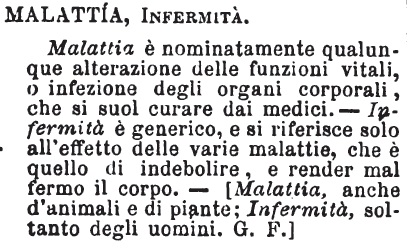 | Malattia, Infermità - Malattia è nominatamente qualunque alterazione delle funzioni vitali, o infezione degli organi corporali, che si suol curare dai medici. - Infermità è generico, e si riferisce solo all'effetto delle varie malattie, che è quello di indebolire, e render mal fermo il corpo. - [Malattia, anche d'animali e di piante; Infermità, soltanto degli uomini. G.F.] [immagine] |
