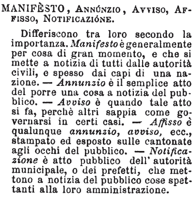 Manifesto, Annunzio, Avviso, Affisso, Notificazione - Differiscono tra loro secondo la importanza. Manifesto è generalmente per cosa di gran momento, e che si mette a notizia di tutti dalle autorità civili, e spesso dai capi di una nazione. - Annunzio è il semplice atto del porre una cosa a notizia del pubblico. - Avviso è quando tale atto si fa, perchè altri sappia come governarsi in certi casi. - Affisso è qualunque annunzio, avviso, ecc., stampato ed esposto sulle cantonate agli occhi del pubblico. - Notificazione è atto pubblico dell'autorità municipale, o dei prefetti, che mettono a notizia del pubblico cose spettanti alla loro amministrazione. [immagine]