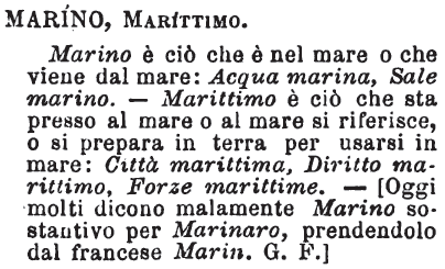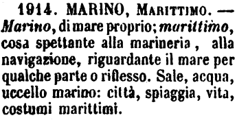 | Marino, Marittimo - Marino è ciò che è nel mare o che viene dal mare: Acqua marina, Sale marino. - Marittimo è ciò che sta presso al mare o al mare si riferisce, o si prepara in terra per usarsi in mare: Città marittima, Diritto marittimo, Forze marittime. - [Oggi molti dicono malamente Marino sostantivo per Marinaro prendendolo dal francese Marin, G.F.] [immagine] |