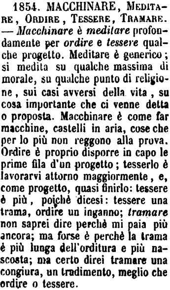 | Macchinare, Meditare, Ordire, Tessere, Tramare - Macchinare è meditare profondamente per ordire e tessere qualche progetto. Meditare è generico; si medita su qualche massima di morale, su qualche punto di religione, sui casi avversi della vita, su cosa importante che ci venne detta o proposta. Macchinare è come far macchine, castelli in aria, cose che per lo più non reggono alla prova. Ordire è proprio disporre in capo le prime fila d'un progetto; tesserlo è lavorarvi attorno maggiormente, e, come progetto, quasi finirlo: tessere è più, poichè dicesi: tessere una trama, ordire un inganno; tramare non saprei dire perchè mi paia più ancora; ma forse è perché la trama è più lunga dell'orditura e più nascosta; ma certo direi tramare una congiura, un tradimento, meglio che ordire o tessere. [immagine] |