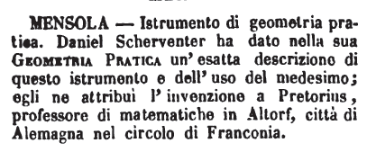 | Mensola - Istrumento di geometria pratica. Daniel Scherventer ha dato nella sua Geometria Pratica un'esatta descrizione di questo istrumento e dell'uso del medesimo; egli ne attribuì l'invenzione a Pretorius, professore di matematiche in Altorf, città di Alemagna nel circolo di Franconia. [immagine] |